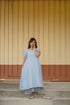 Introducing our Ice Blue Linen Dress, a perfect blend of style and comfort. This dress features panels for added flare and elastized sleeves for a relaxed fit. The anti-fit drop shoulder design gives it a modern, effortless look. The dress comes with a grey net border slip inside.